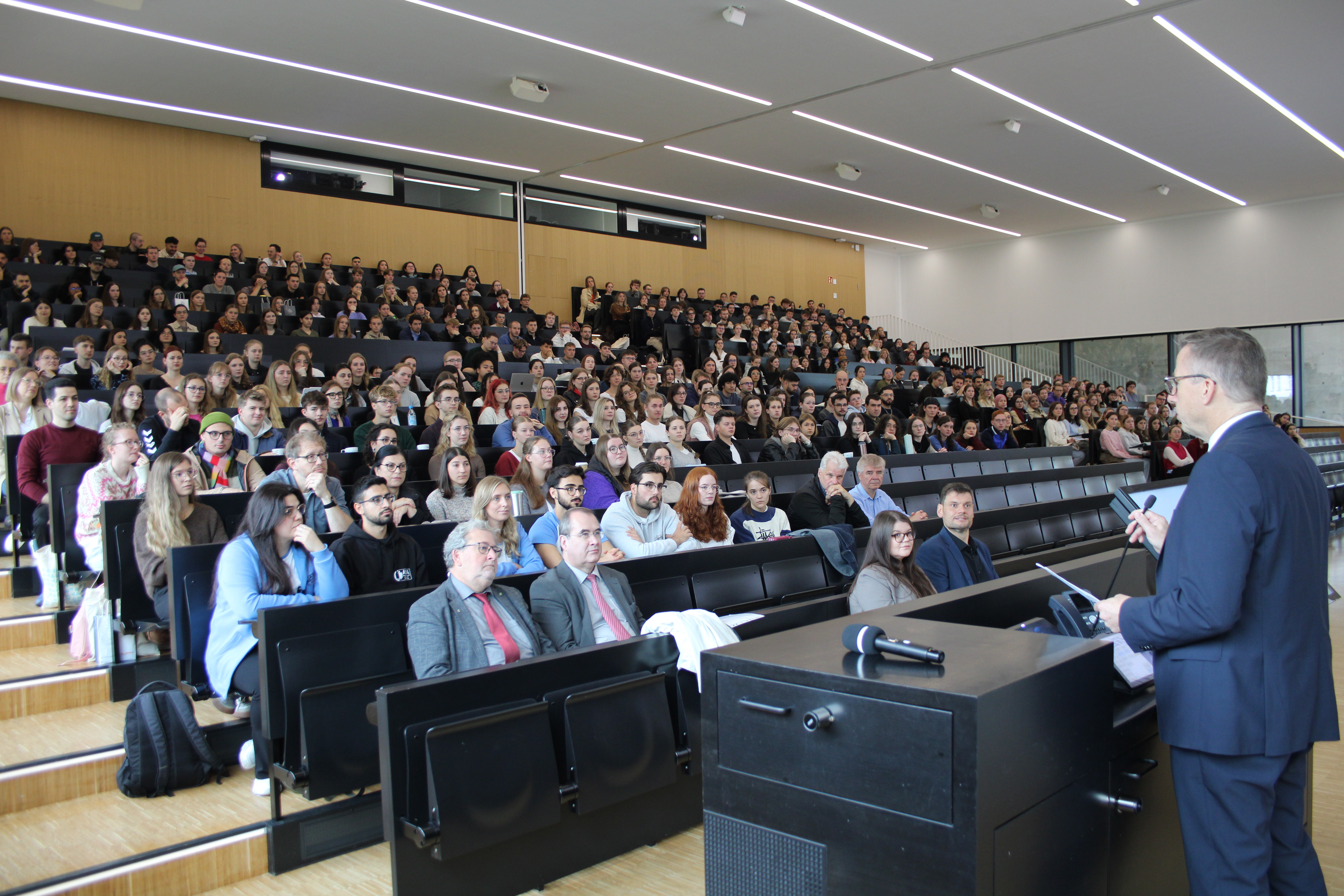 Unipräsident Prof. Dr. Ludger Santen begrüßte die Studierenden, vorn in der ersten Reihe des Hörsaals sitzen Bürgermeister Manfred Rippel (l.) und der Dekan der Medizinischen Fakultät der Universitätsklinik des Saarlands (UKS), Prof. Dr. Matthias Hannig. Foto: Jürgen Kruthoff