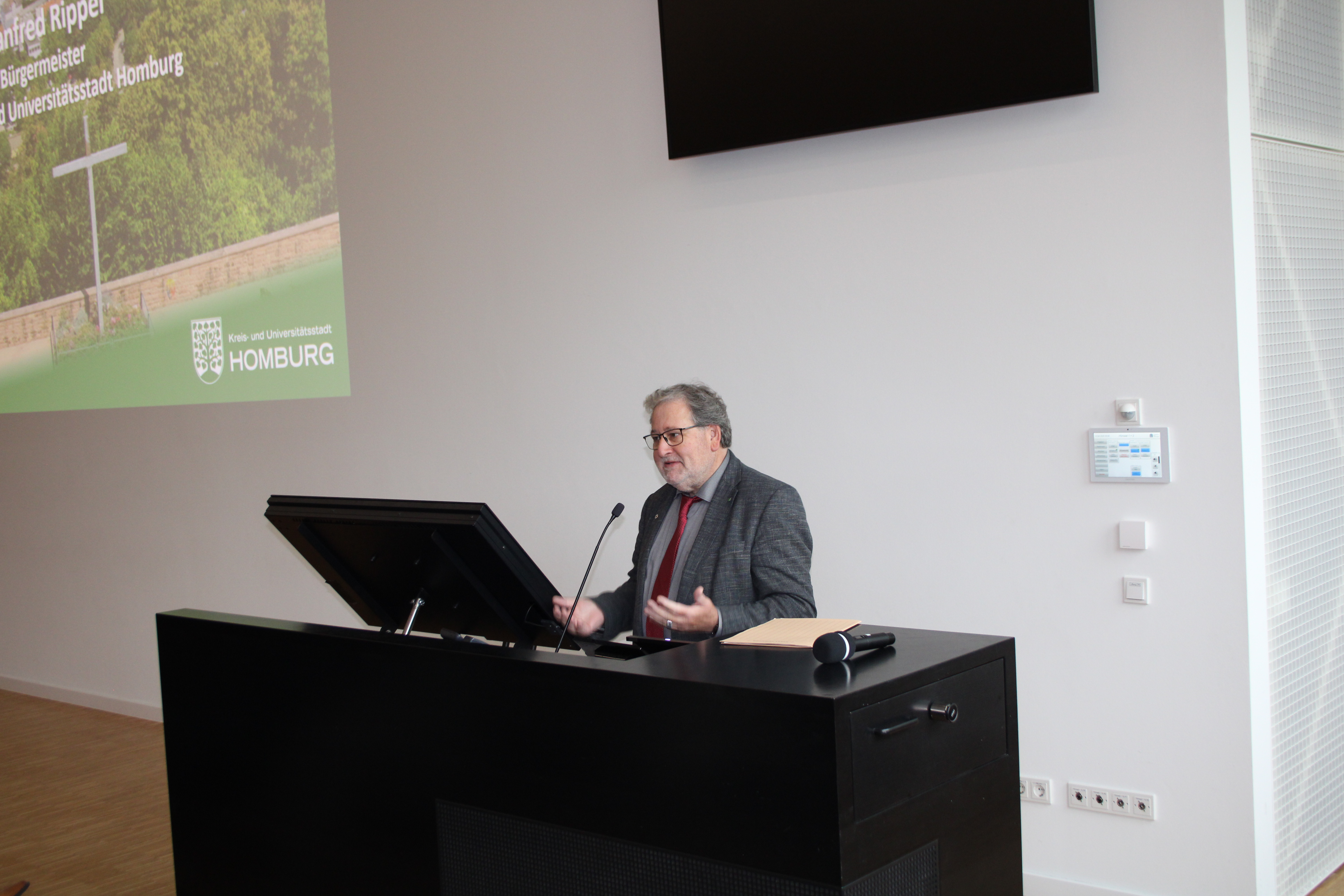 Bürgermeister Manfred Rippel nutzte die Gelegenheit, um den Erstsemestern nicht nur alles Gute und viel Erfolg für den Start in diesen neuen Lebensabschnitt zu wünschen, sondern die Stadt Homburg vorzustellen. Er betonte besonders, dass die Stadt Homburg den mit 10.000 Euro dotierten Wissenschaftspreis nach einem Beschluss des Stadtrats nun jährlich ausschreibe und damit die besondere Verbundenheit zum UKS zeige. „Das UKS ist nicht nur da Gesundheitszentrum der Region, sondern auch ein wesentlicher Bestandteil Homburg als Wirtschafts- und Wissenschaftsstandort“, sagte Manfred Rippel.
