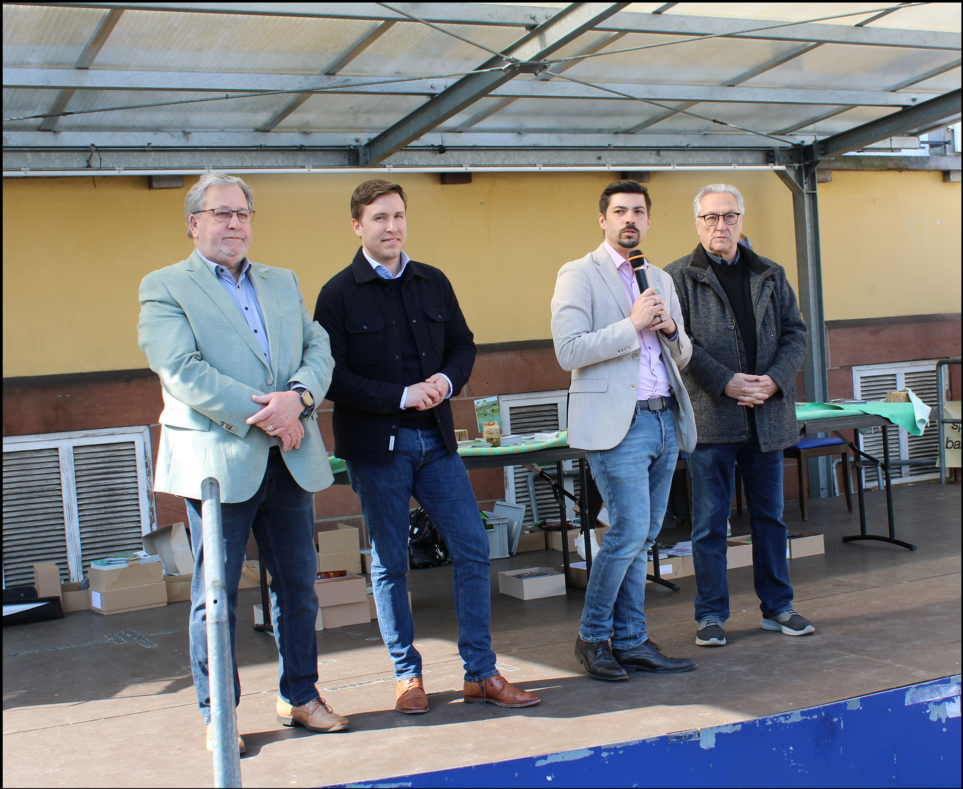 Bei der offiziellen Eröffnung des Keramikmarktes kamen Bürgermeister Manfred Rippel, MdB und Kreisbeigeordneter Esra Limbacher, der Beigeordnete Philipp Scheidweiler und der Kulturbeigeordnete Raimund Konrad (v. l.) auf die Bühne am Marktplatz.
