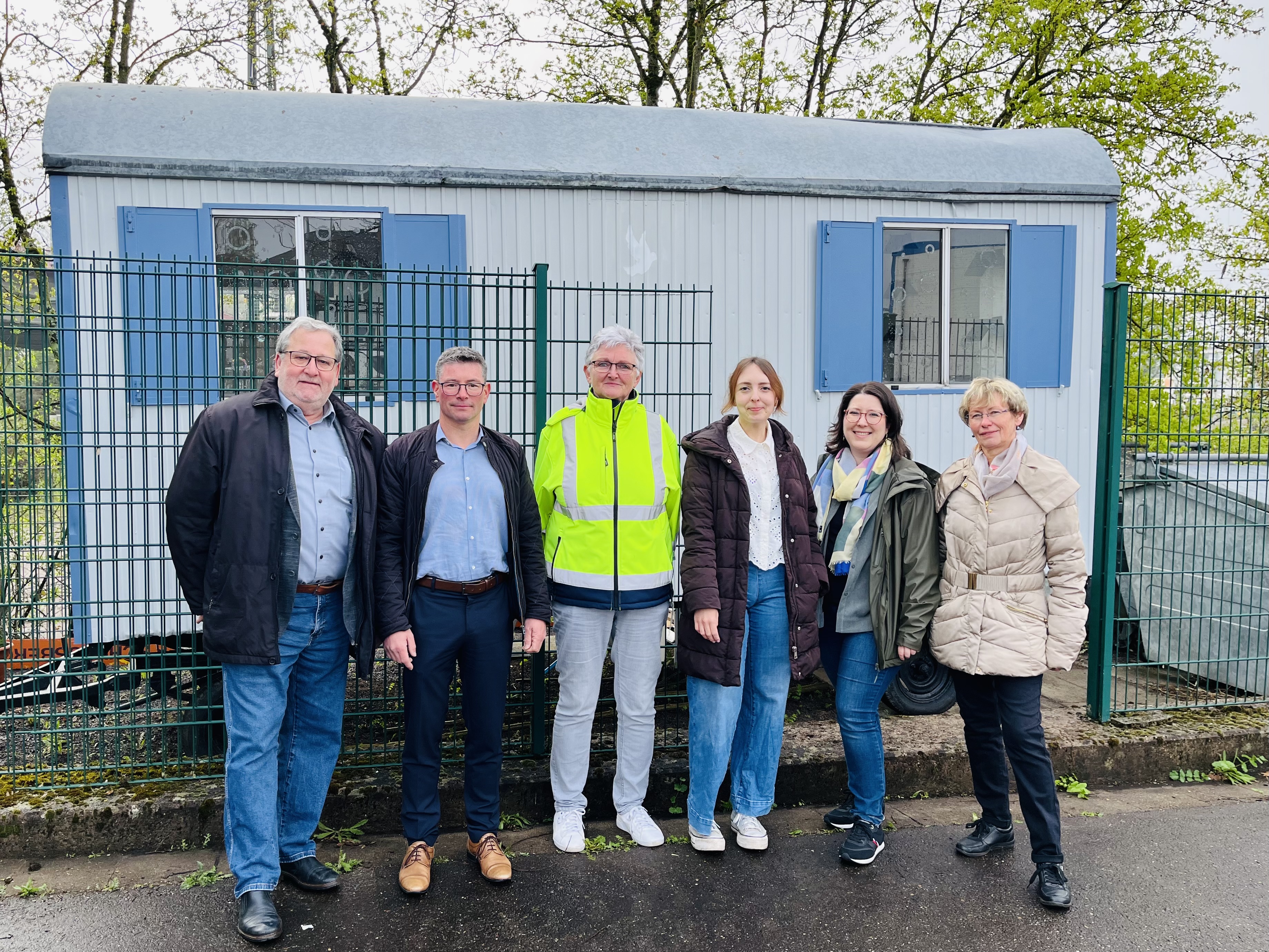 Vertreterinnen und Vertreter von Stadtverwaltung und Verein beim gemeinsamen Besichtigungstermin am neuen Taubenschlag am Baubetriebshof.