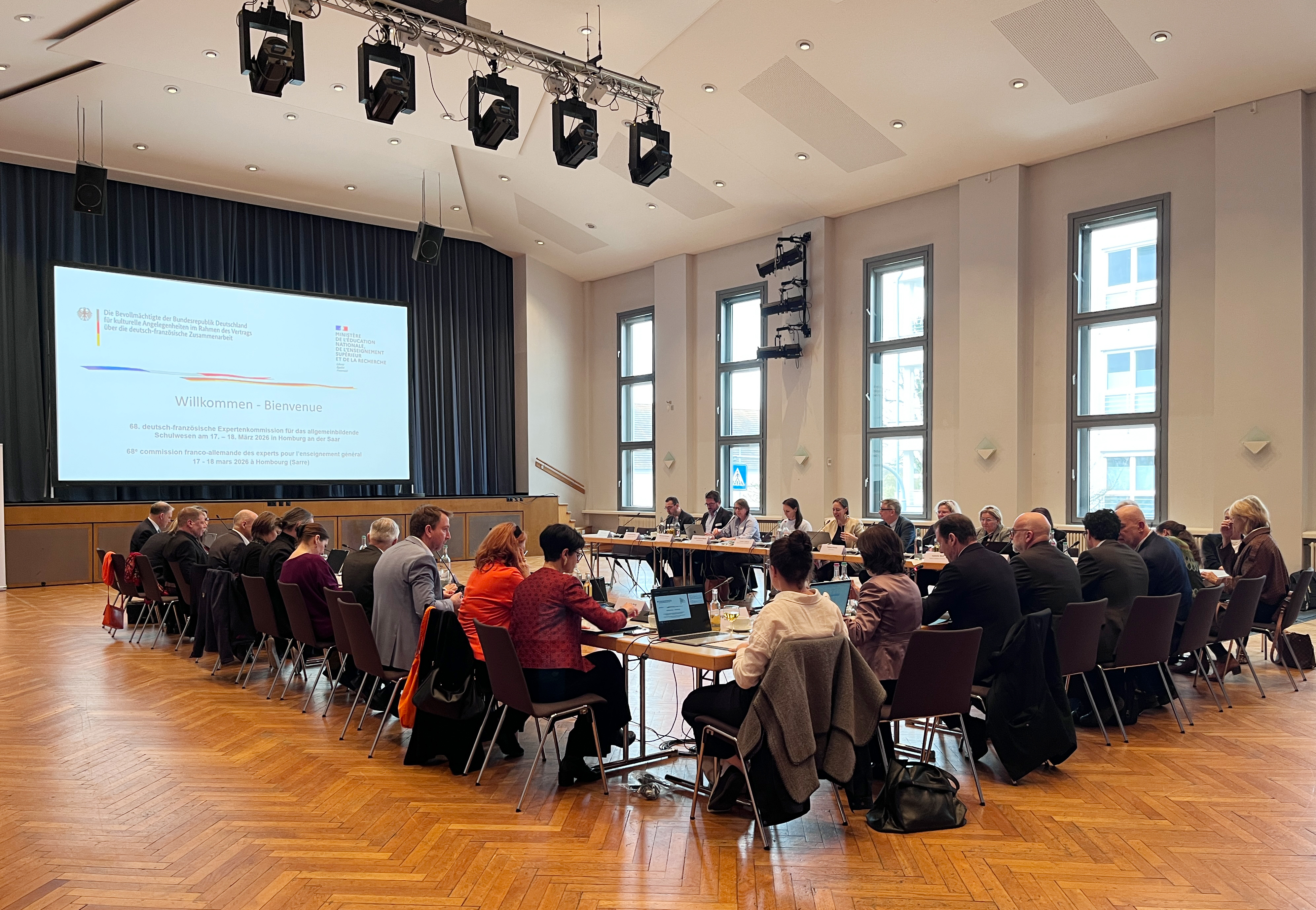 In dieser Woche war die Kreis- und Universitätsstadt Homburg Schauplatz der 68. Tagung der deutsch-französischen Expertenkommission für das allgemeinbildende Schulwesen. Oberbürgermeister Michael Forster hieß die Teilnehmerinnen und Teilnehmer im Kulturzentrum Saalbau willkommen. Die Veranstaltung wurde von der Europaabteilung der Staatskanzlei des Saarlandes im Rahmen des Mandats von Ministerpräsidentin Anke Rehlinger als Bevollmächtigte für Kultur und Bildung ausgerichtet.