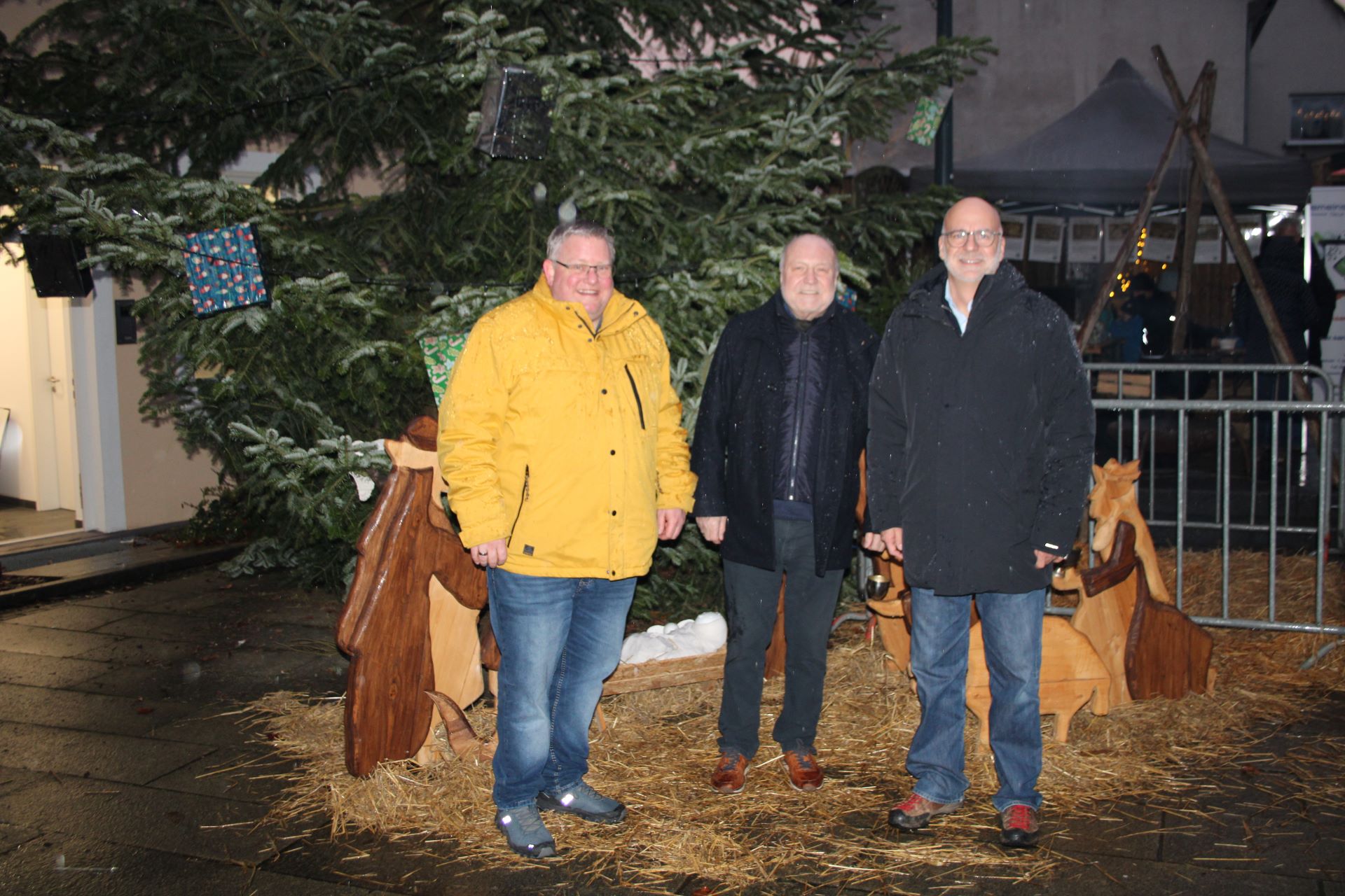 Erbachs Ortsvorsteher Markus Uhr, der 1. Vorsitzende der Stadtteilkonferenz „Lebendiges Erbach“, Friedrich Burgard und Oberbürgermeister Michael Forster (v. l. n. r.) vor der Krippe, die den Erbacher Weihnachtsmarkt schmückt.