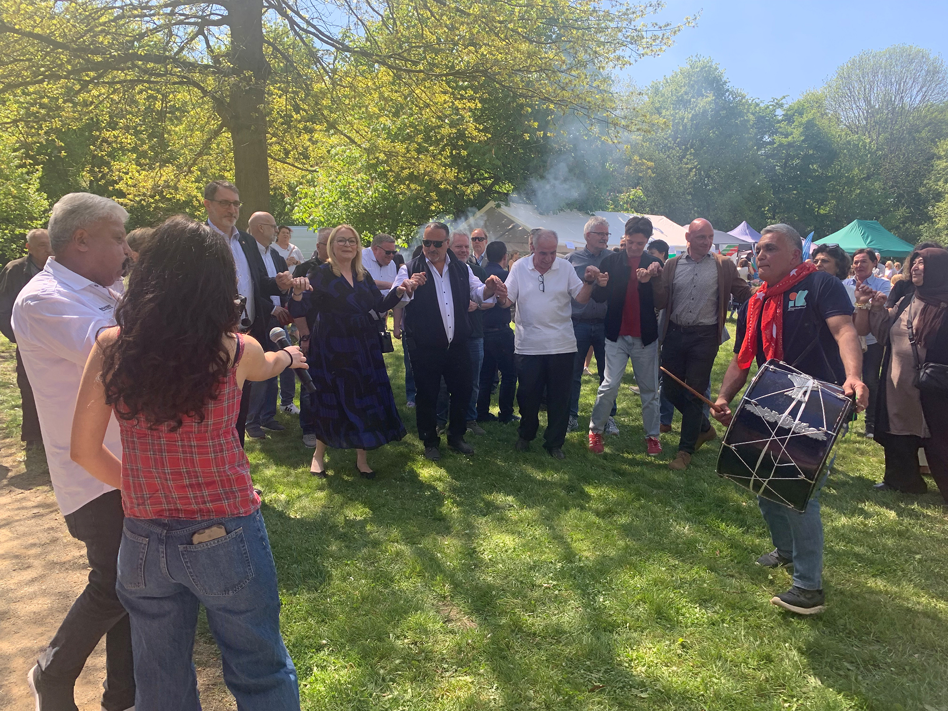 Bild 1: Tanz, Musik und gute Laune: Beim deutsch-türkischen Tulpenfest im Homburger Stadtpark feiern Gäste ausgelassen und ließen sich von rhythmischen Klängen zum gemeinsamen Tanzen mitreißen.