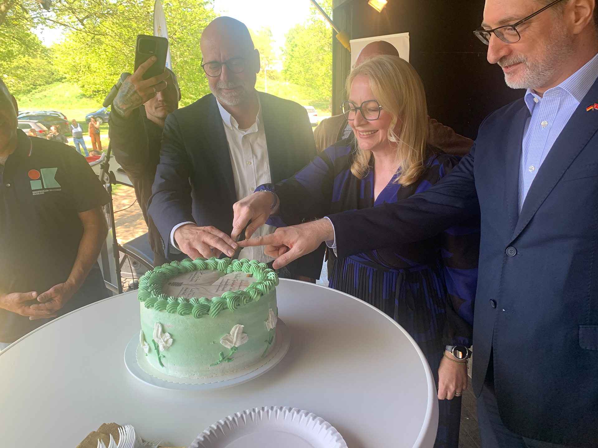 Bild 4: (v. l. n. r.) Oberbürgermeister Michael Forster, Ministerin Christine Streichert-Clivot und Generalkonsul Mehmet Akif Inam beim feierlichen Tortenanschnitt.