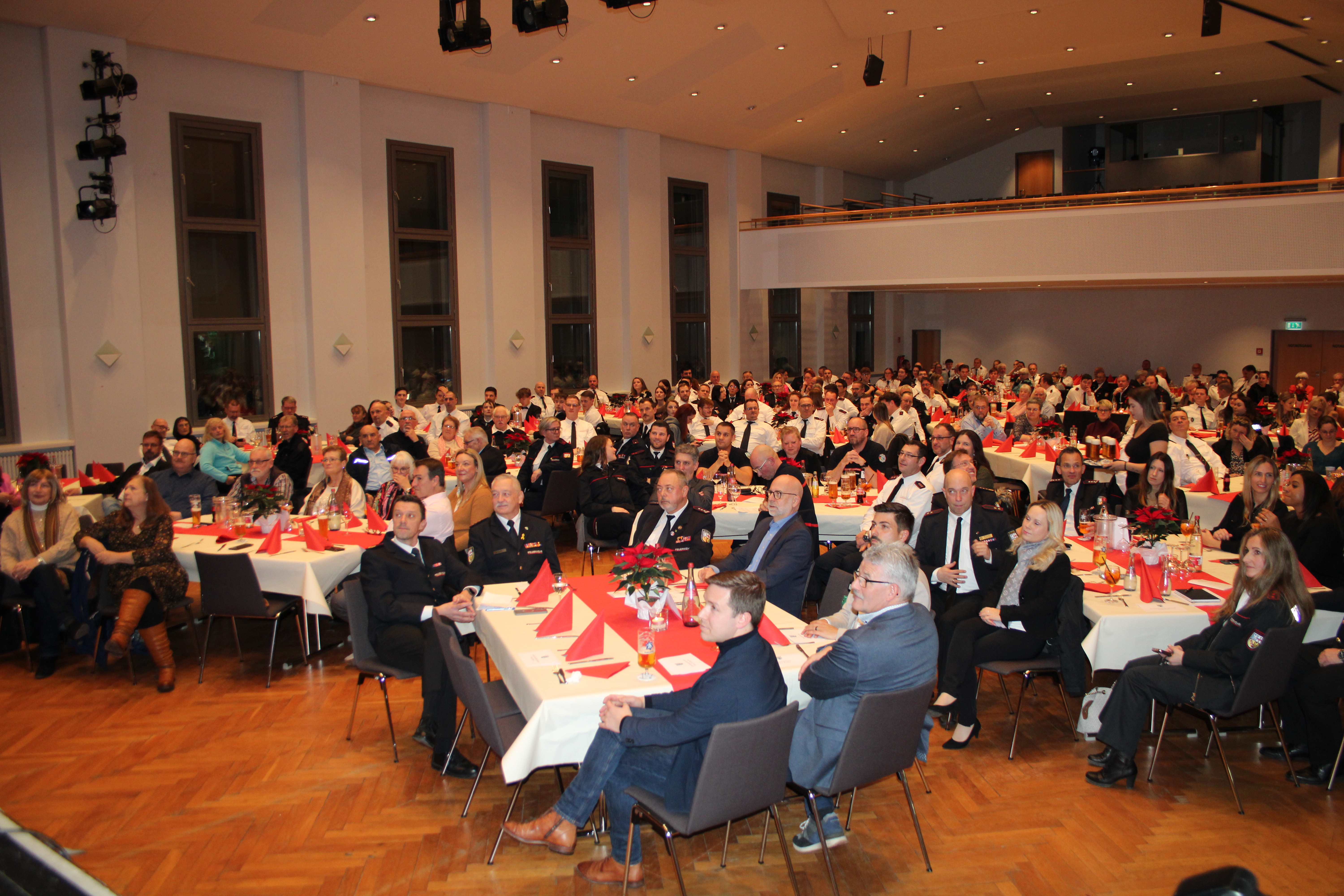 Bevor der Oberbürgermeister als oberster Feuerwehrmann der Stadt zu Wort kam und abschließend allen Feuerwehrleuten eine ruhige Weihnachtszeit und stets eine gesunde Rückkehr von ihren Einsätzen wünschte, hatte zunächst Bürgermeister Manfred Rippel die zahlreichen Feuerwehrleute und ihre Partnerinnen und Partner sowie die vielen Ehrengäste, darunter den Bundestagsabgeordneten Esra Limbacher, zahlreiche Stadtratsmitglieder und Ortsvorsteherinnen und Ortsvorsteher und auch Gäste von der Feuerwehr aus der Partnerstadt La Baule im nahezu vollbesetzten Saalbau begrüßt.