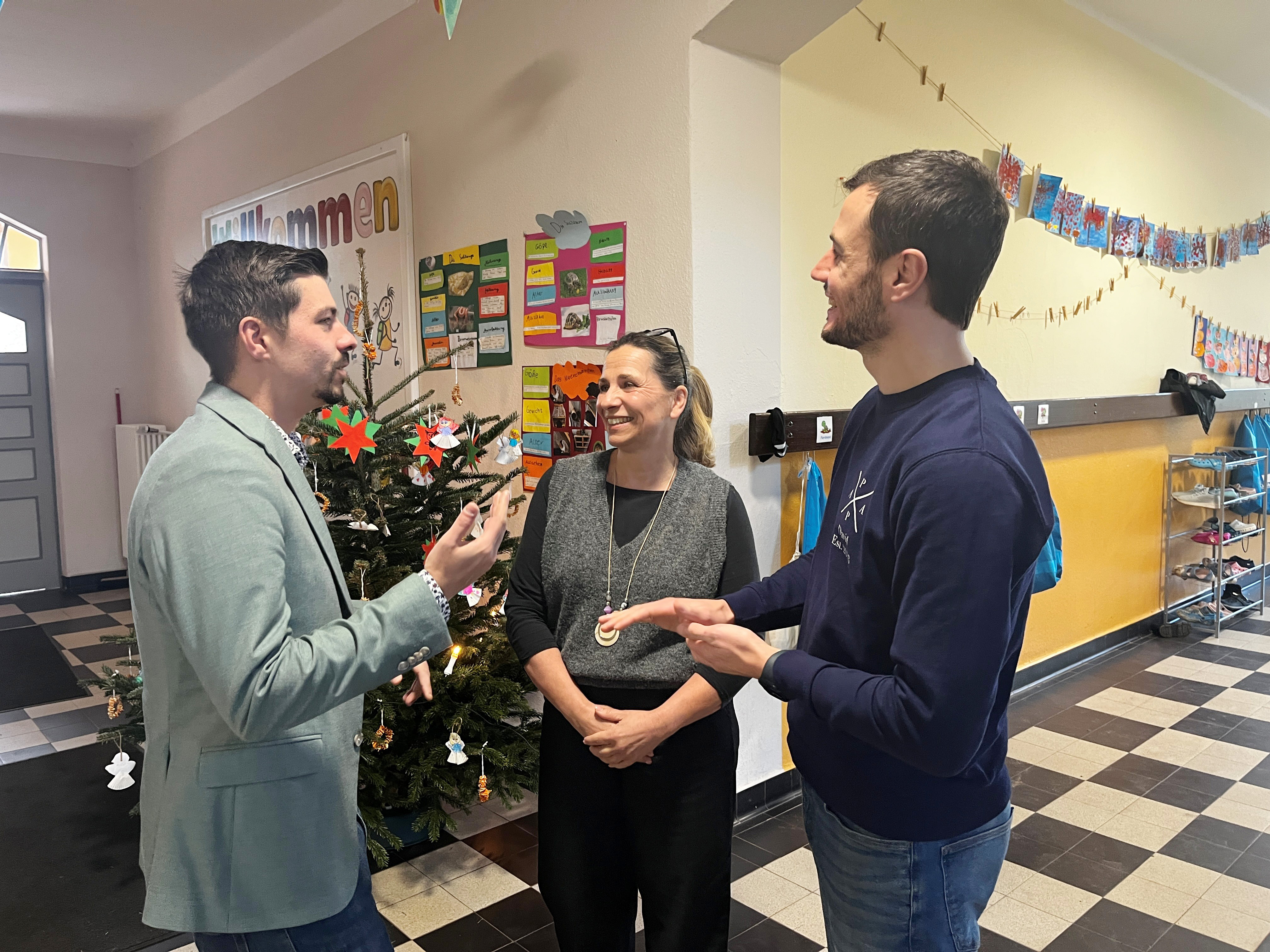 Austausch zwischen Stadt und Schulleitungen zum Jahresende: (v. l. n. r) Der Beigeordnete Philipp Scheidweiler im Gespräch mit Schulleiterin Susanne Braul-Schönecker und Amtsleiter für Bildung und Sport, Daniel Schackmar.