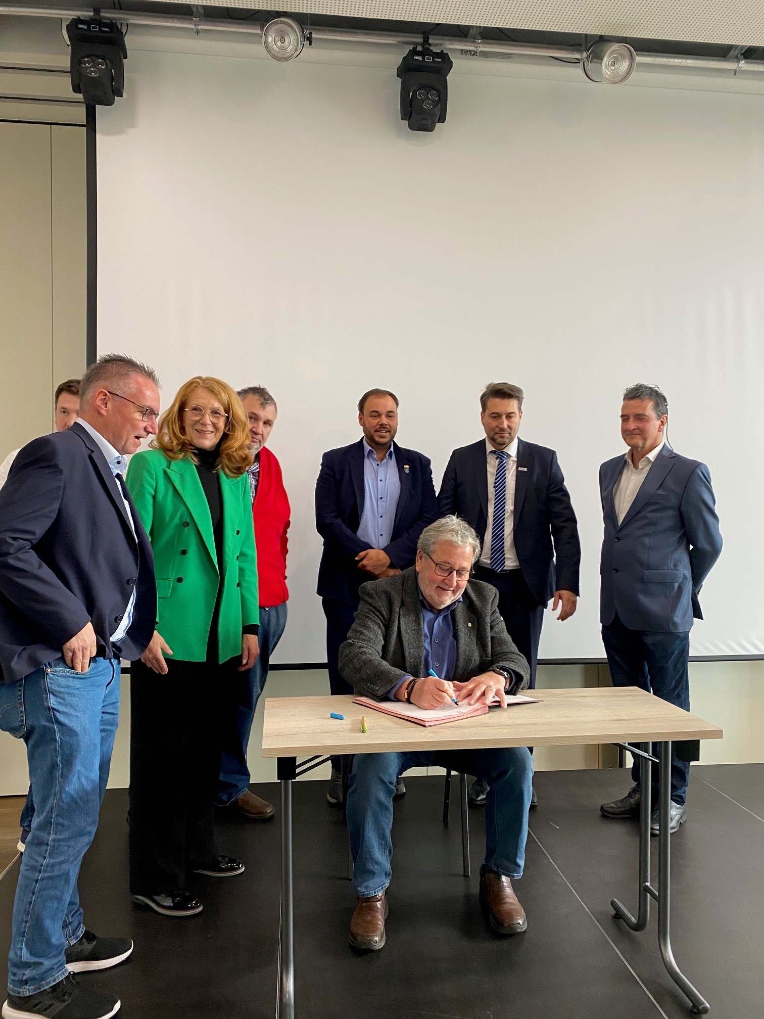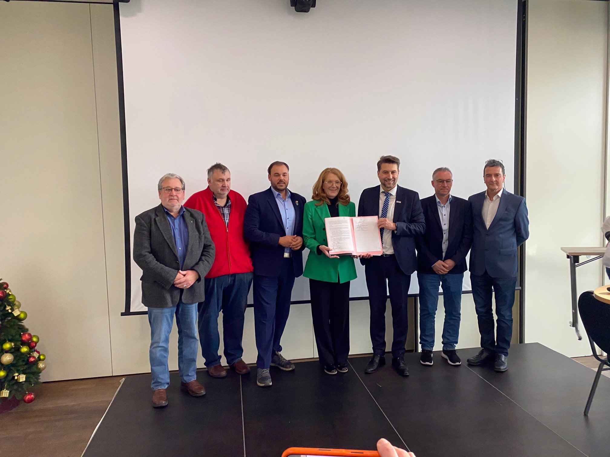 Homburgs Bürgermeister Manfred Rippel, der Beigeordnete Olaf Blaumeiser aus St. Ingbert, Kirkels Bürgermeister Dominik Hochlenert, Ministerin Petra Berg, Saarbrückens Oberbürgermeister Uwe Conrad, der Landrat des Saarpfalz-Kreises Frank John und Dr. Andreas Meiser vom saarländischen Vorstand des VCD präsentieren die gemeinsame Erklärung.